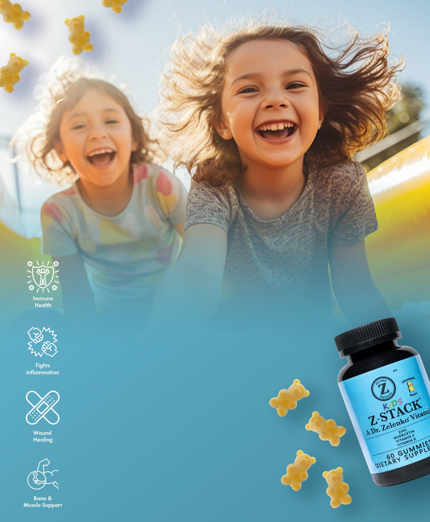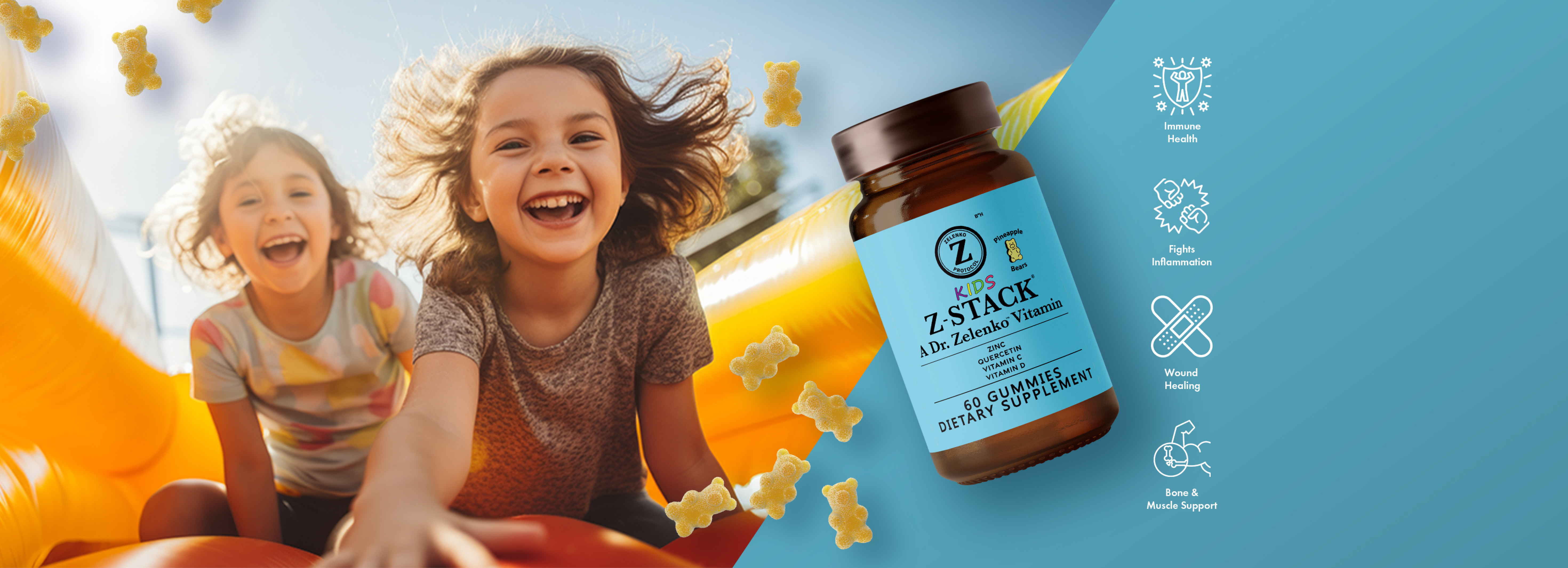 Give your children the immune support they need with Z-Stack® Kids, a specially formulated, all-natural supplement designed to help boost their immune system and support overall health. Created by Dr. Zelenko, the trusted physician behind the original Z-Stack®, Z-Stack® Kids combines essential vitamins and nutrients in a delicious, kid-friendly chewable gummy, available in original pineapple and fruit punch flavors.
